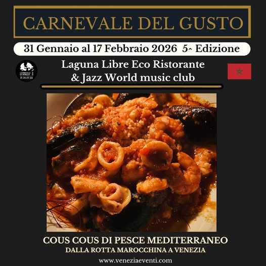 Per il Carnevale del Gusto 2026, Laguna Libre Eco Ristorante & Jazz World Music Club presenta un’inedita creazione: Cous Cous di Pesce Mediterraneo – dalla rotta marocchina a Venezia. Un cous cous ispirato alla tradizione marocchina, che dialoga con il cous cous di pesce trapanese e si reinterpreta in chiave veneziana grazie all’utilizzo di pesce locale, mandorle e rucola. Un autentico viaggio nel Mediterraneo che trova il suo approdo finale in laguna.