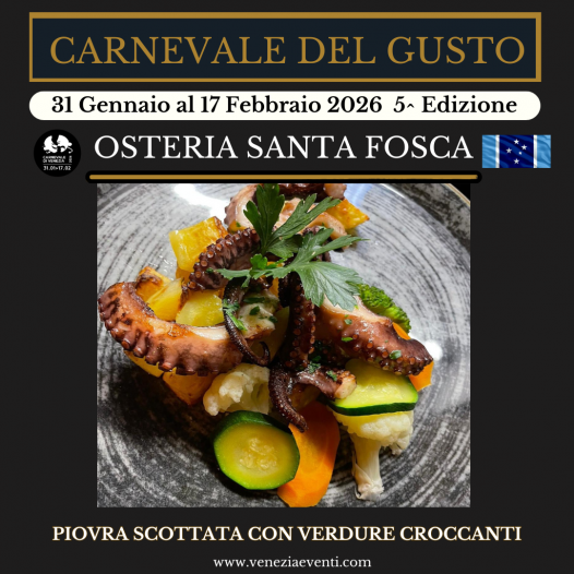 Per il Carnevale del Gusto 2026, l’Osteria Santa Fosca propone una creazione che punta dritto al gusto: Piovra scottata con verdure croccanti — mare e orto che si incontrano in un piatto equilibrato, dove la morbidezza della piovra viene esaltata dal contrasto delle verdure, per un risultato fresco, deciso e moderno.